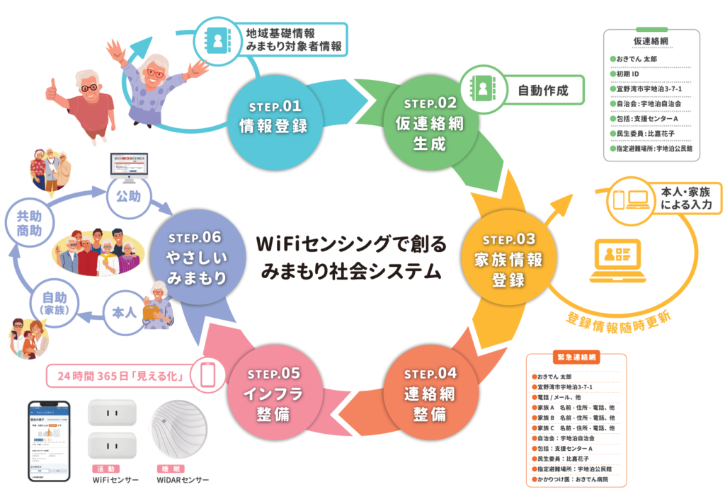 おきでんCplusC では、WiFi センシング技術を活用し、カメラやマイクを使用しないプライバシーに配慮した新しい「みまもり」の形を提唱しております。簡易なIoT デバイスの設置により、高齢者の活動状況や睡眠状態のデータを見える化することができ、ご家族主導で更に地域が一体となった自助・共助・公助による新しい高齢者みまもり社会システムを、自治体と共に構築します。地域関係者や自治体の負担軽減に寄与。孤独死放置防止・災害時の在・不在確認、また個別避難計画等の緊急連絡網整備を支援いたします。